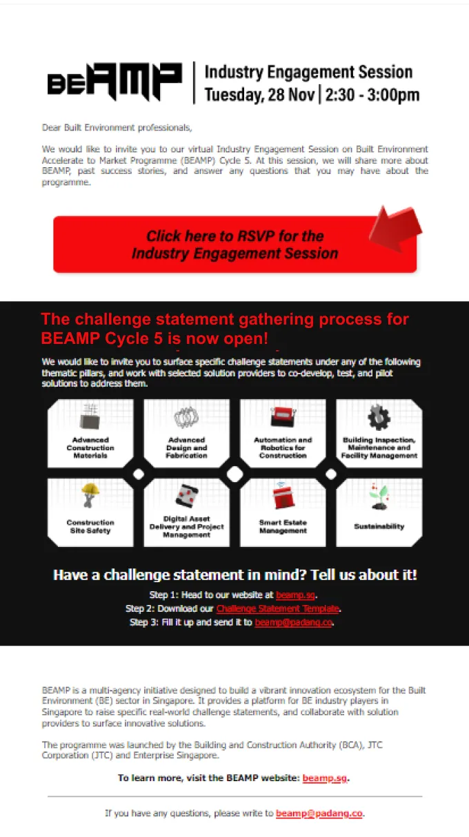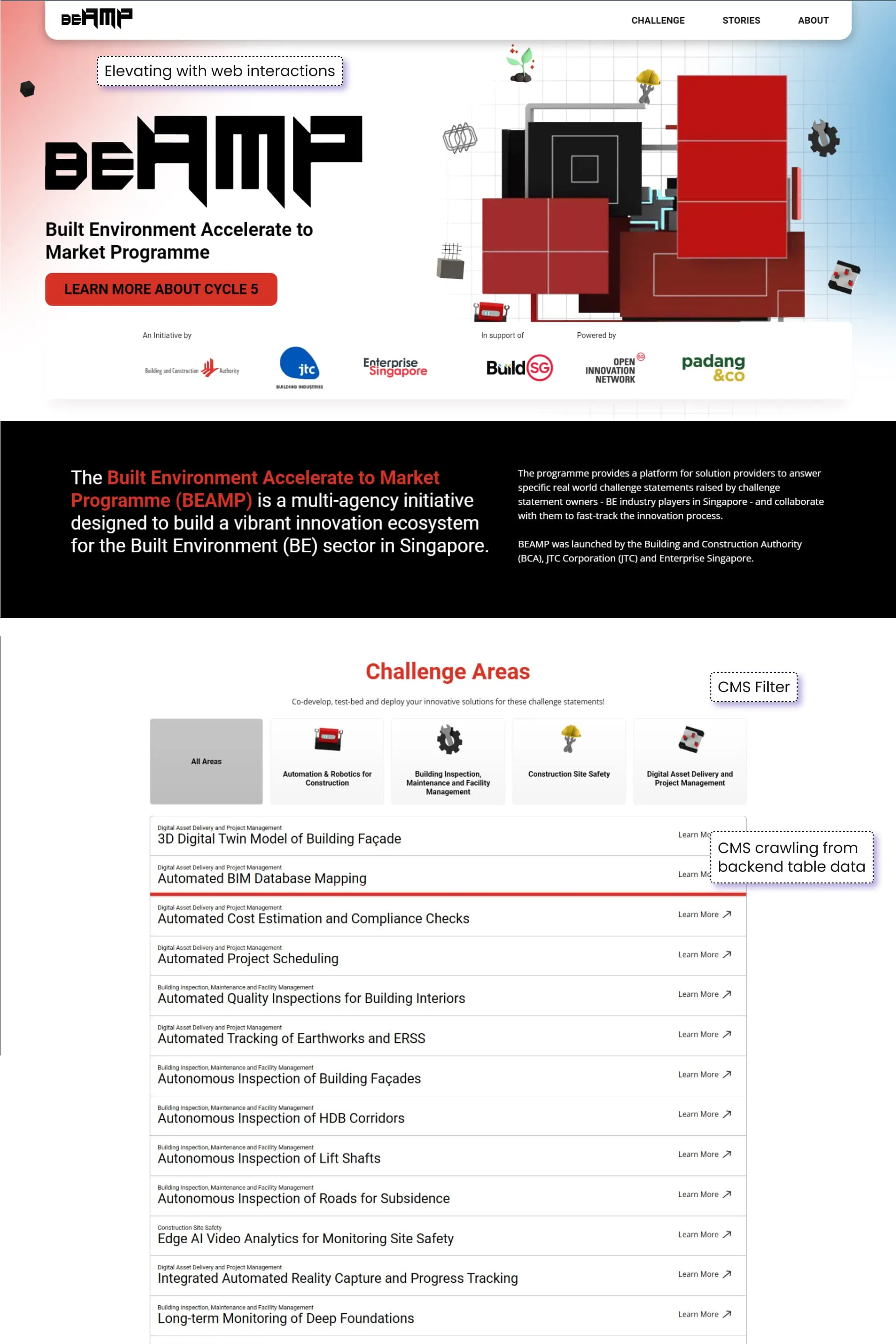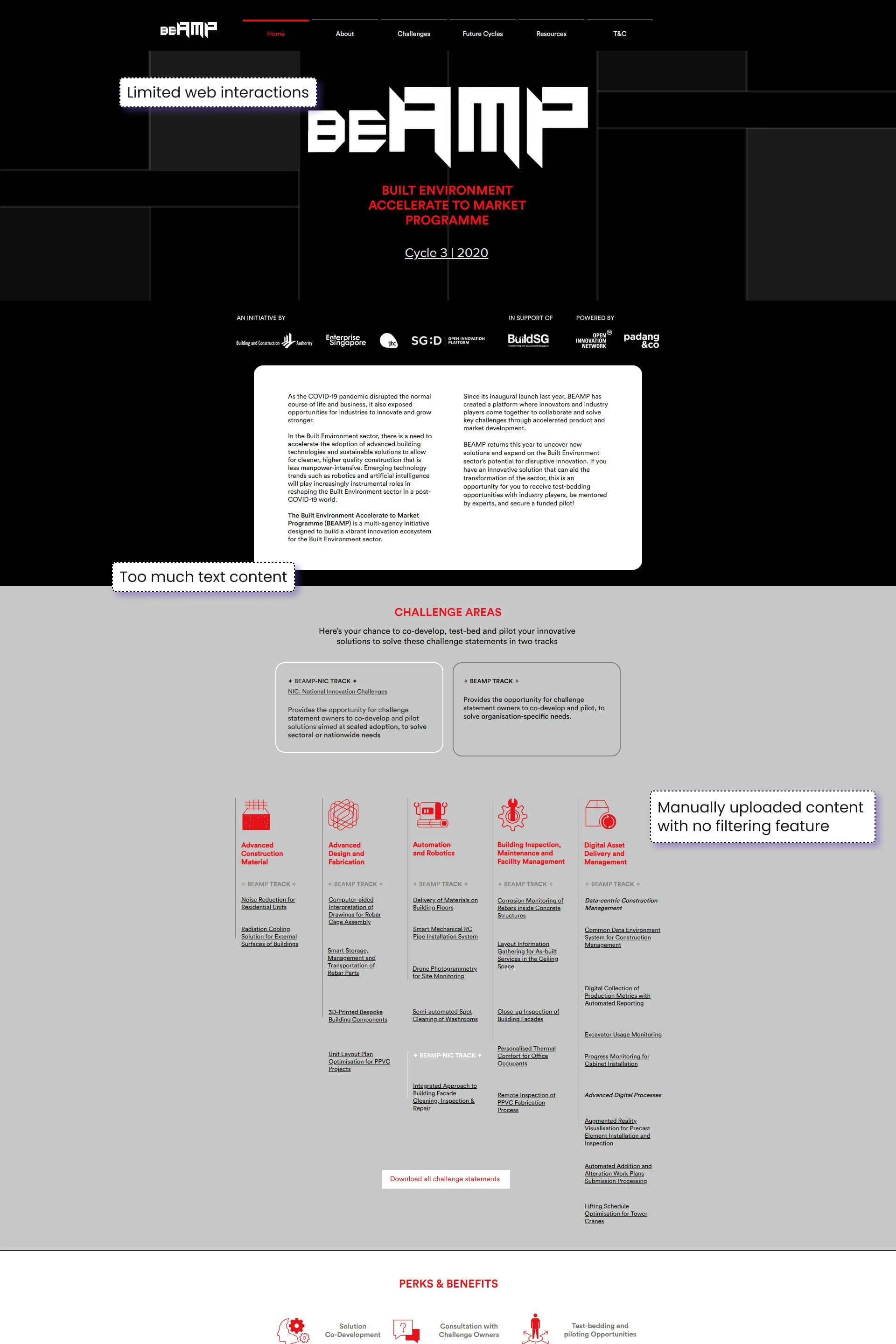 BEAMP is an ecosystem designed to attract solution providers to address specific built environment challenges. Therefore, effective communication mediums that deliver messages clearly and create a seamless user journey are key objectives of this project.